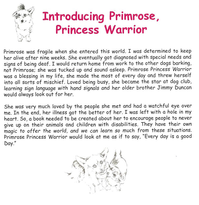 Primrose Princess Warrior was a special needs pup who was determined to enjoy every moment of her life. She loved every new toy, from balls to the simplest things to a cardboard box. Even though her Brother Jimmy’s watchful eye was over her, she would somehow find a way to get up to mischief.